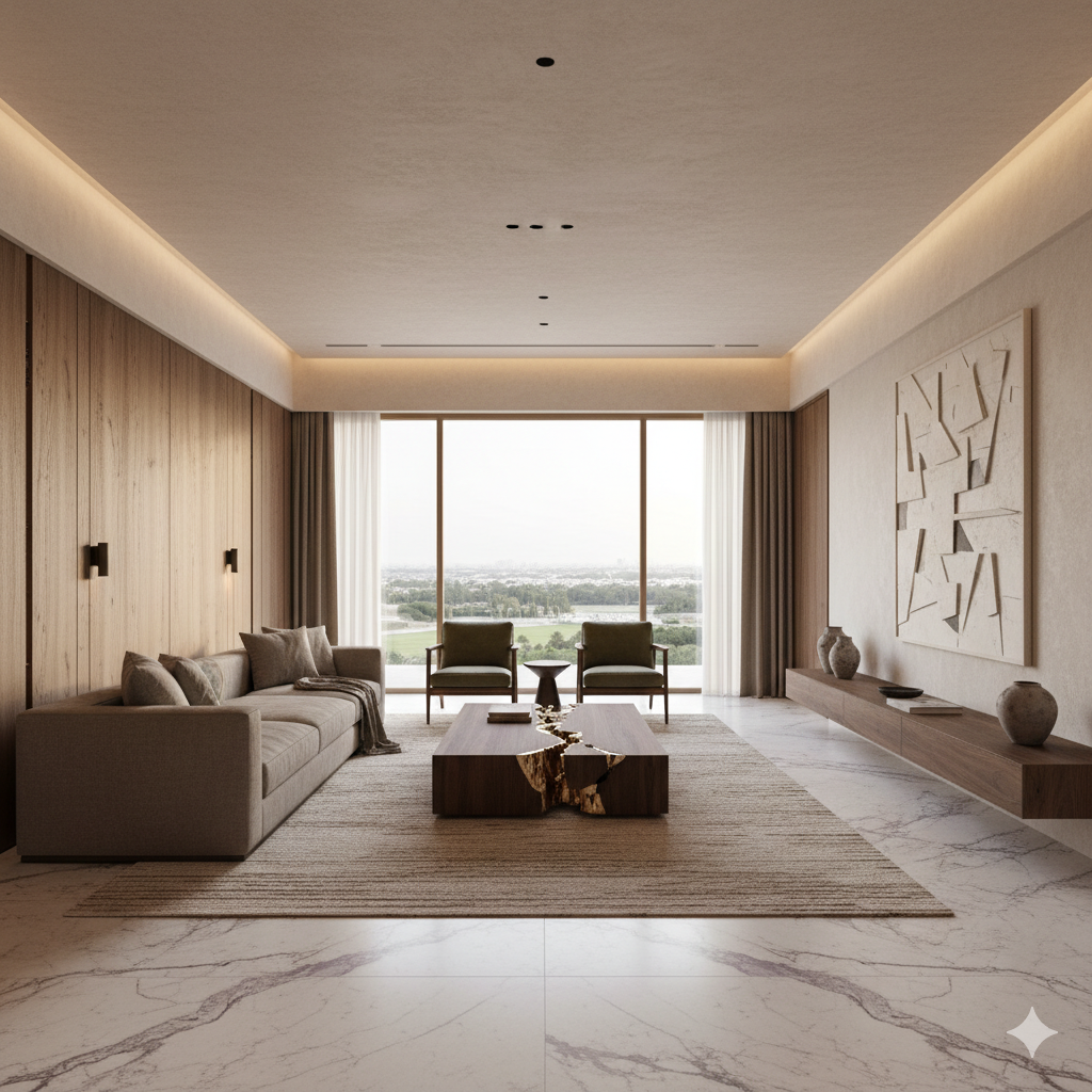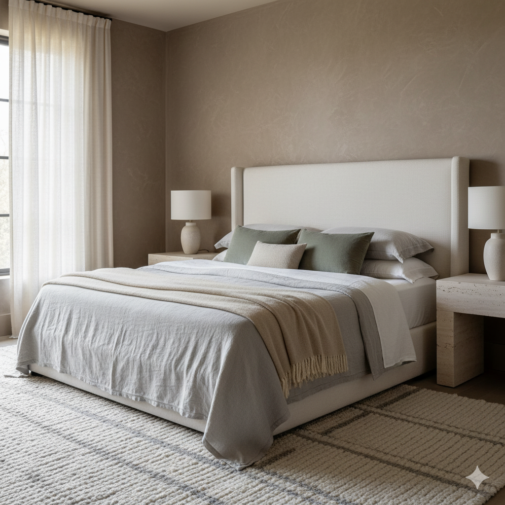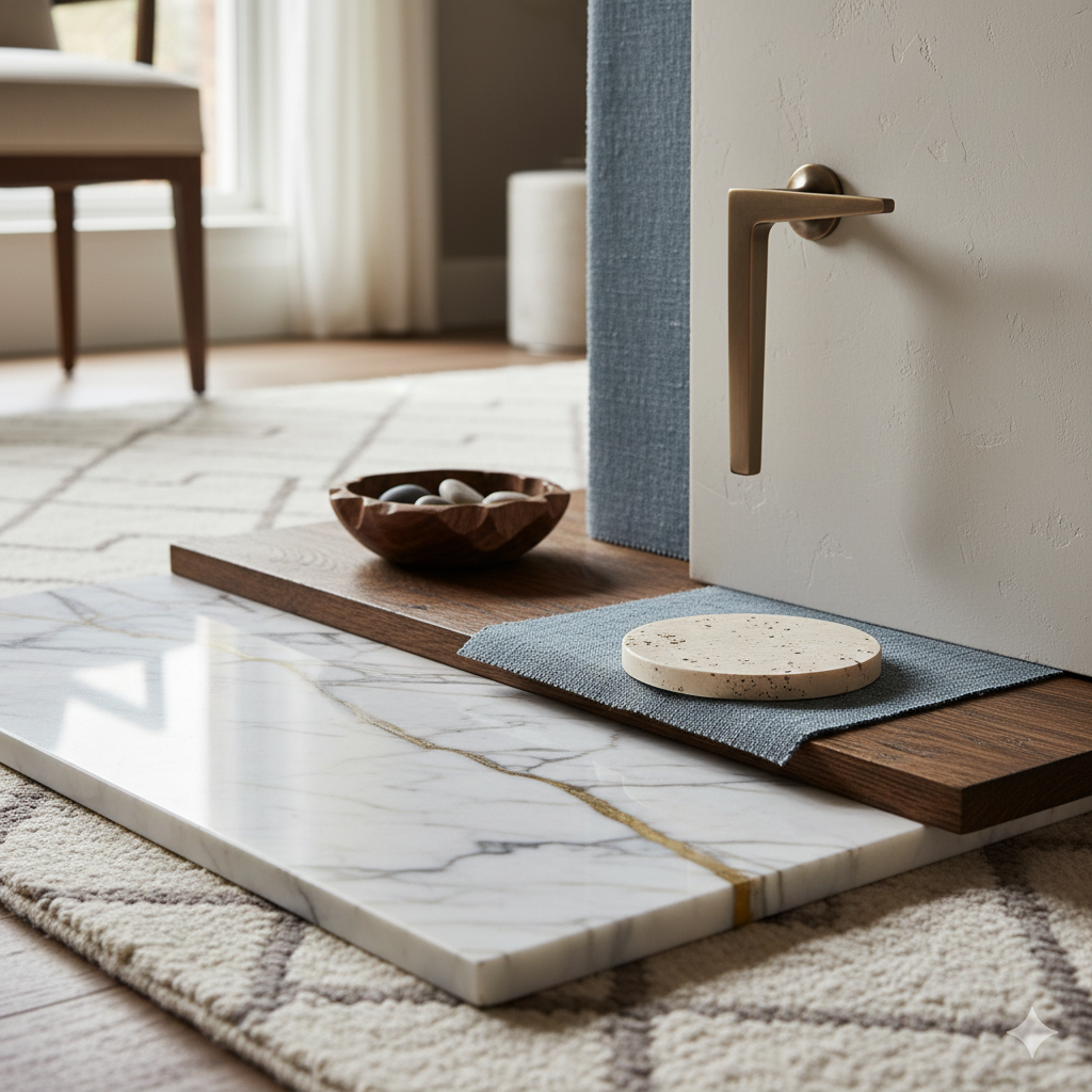 Fine natural stone like Calacatta marble, travertine, and limestone that showcase geological artistry. Hand-selected wood species with exceptional grain patterns, finished with traditional techniques. Tactile textiles such as Belgian linen, cashmere blends, and hand-woven fabrics that invite touch. Brushed metals and aged bronze that offer subtle luster without mirror-like shine.